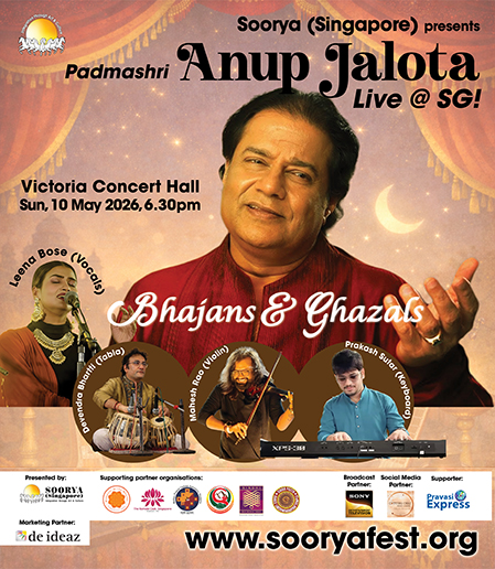 An evening of exhilarating and soulful bhajans and ghazals by the legend, Bhajan Samrat (emperor of bhajans). A rare live concert in Singapore by one of the greatest living exponents of the genre, Anup Jalota. Acclaimed Bollywood singer Leena Bose on vocals support. Distinguished accompanists – Mahesh Rao (Violin), Devendra K. Bhartti (Tabla), and Prakash Sutar (Keyboard). An evening of blissful devotion, poetry, and soul-stirring melodies awaits — not to be missed!